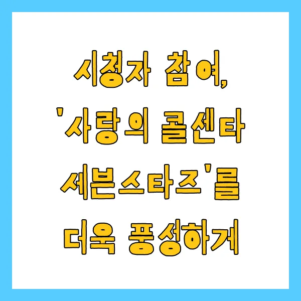 '사랑의 콜센타 세븐스타즈'는 시청자들의 적극적인 참여로 더욱 풍성하고 재미있는 프로그램이 됩니다. 지금 바로 참여하고 특별한 추억을 만들어보세요!